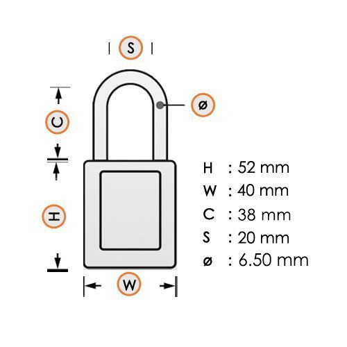 Gemäß OSHA-Anforderungen: Ja Anzahl der mitgelieferten Schlüssel: 1 (OSHA-Norm) Bügel Durchmesser: 6.50 mm Bügel Länge: 38 mm Bügel Material: Gehärtetem Stahl mit Nylonschutz Gehäuse Material: Aluminium mit Kunststoffummantelung Lasergravur möglich: Ja (optional) Schliessanlage: Verschieden schliessend oder Gleichschliessend Hauptschlüssel möglich: Ja (optional) Vorhängeschloss-Etiketten: Einschließlich „Danger“ und „Property of“ in Deutsch und English Schlüsselerfassung Service: Nee Schlüsselfunktion: Schlüsselrückhaltung Temperaturbereich: -57 °C bis +177 °C Zugfestigkeit in geschlossener Position: 114 kg ATEX-Bescheinigung: - Beständig gegenüber Chemikalien: Ja Korrosionsbeständig: Ja Nicht magnetisches Vorhängeschloss: Ja Silikon-frei: Nee UV-beständiges: Ja -