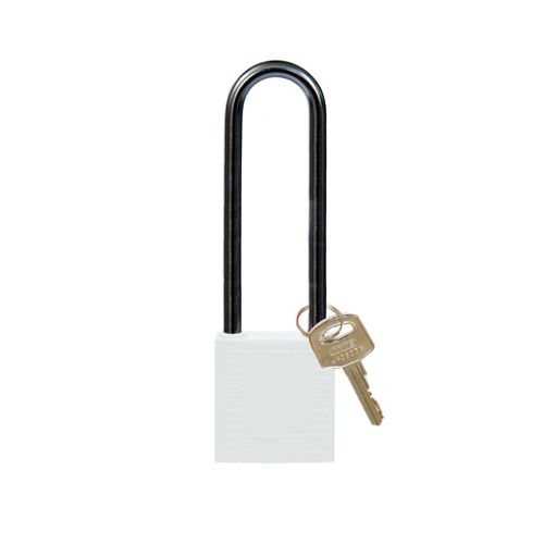 Nylon Sicherheitsvorhängeschloss weiss mit (ø 4,70mm, H 75mm) Bügel aus Aluminium und Schlüsselrückhaltung.