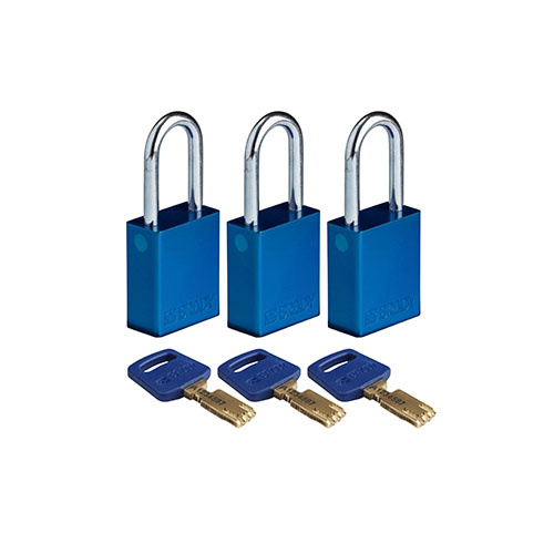 3-pack SafeKey aluminium Sicherheitsvorhängeschloss Blau mit (Ø6,40mm, H 38mm) Bügel aus gehährtetem Stahl und Schlüsselrückhaltung. Alle Gleichschliessend.