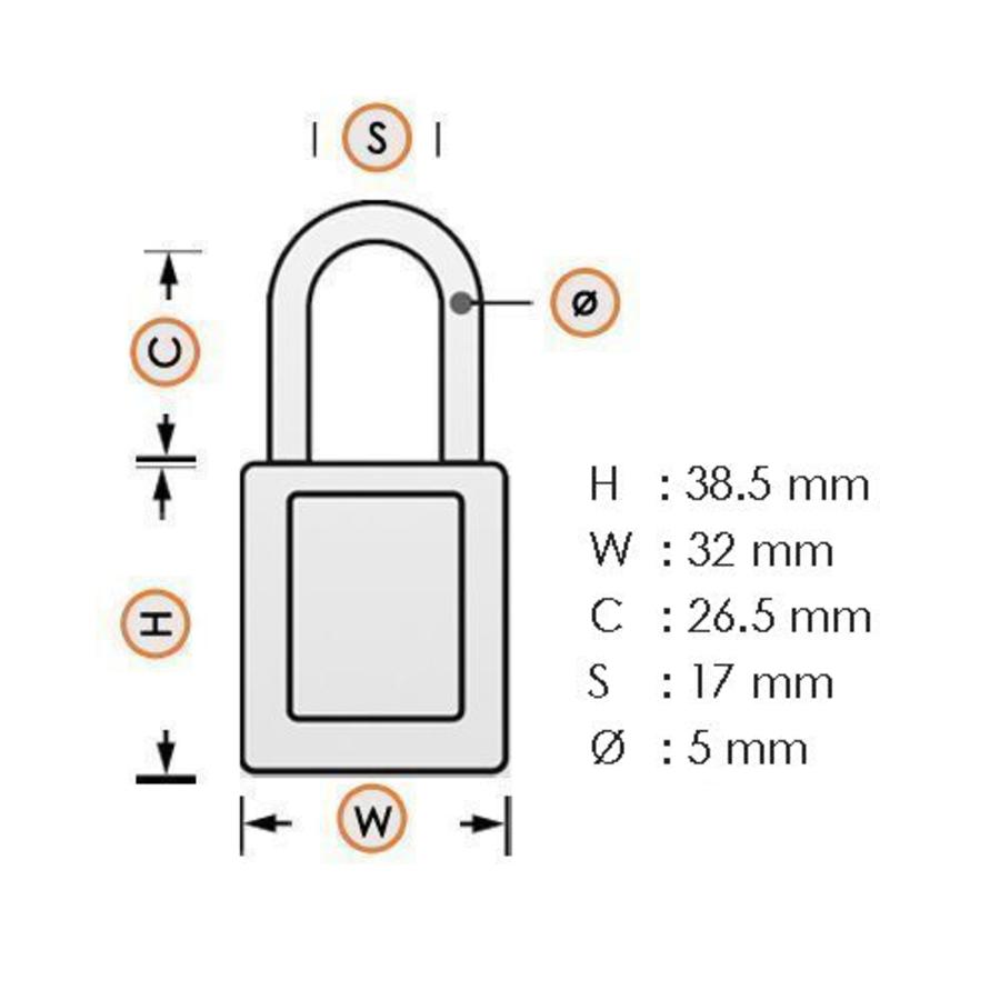 Complies with OSHA regulations: Yes Supplied keys: 1 Shackle diameter: 4,70 mm Shackle height: 38mm Shackle material: NANO Protect steel Body material: Anodized aluminium Laser engraving possible: Yes (optional) Key systems: Keyed different, other options on request Master-keyed possible: Yes (optional) Padlock labels: No Key charting service: No Lock mechanism: Key retained Temperature range: -57 °C to +177 °C Pull strenght resistance: 114 Kg ATEX-certified: - Chemical resistant: No Corrosion resistant: Yes Non-magnetic padlock: No Silicone free: No UV-stable: Yes -