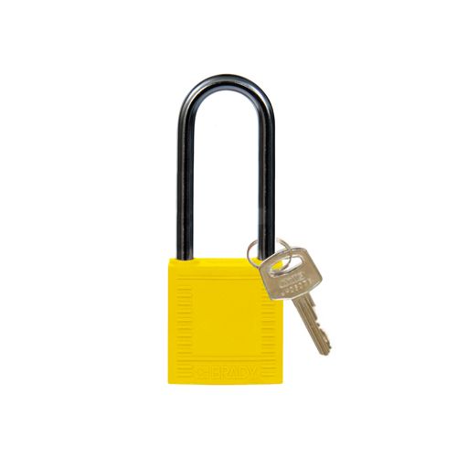 Nylon compact safety padlock yellow with a (ø 4,70mm, H 50mm) aluminum shackle and key retaining function.