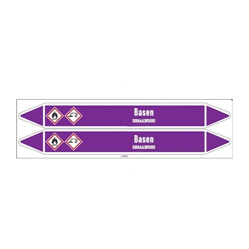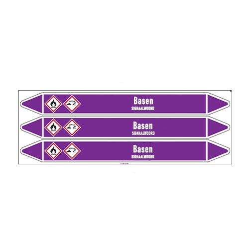 Leidingmerkers voor Ammoniak in Nederlands met tekst en symbolen. Categorie: Basen. Beschikbaar in verschillende formaten en met of zonder drager.