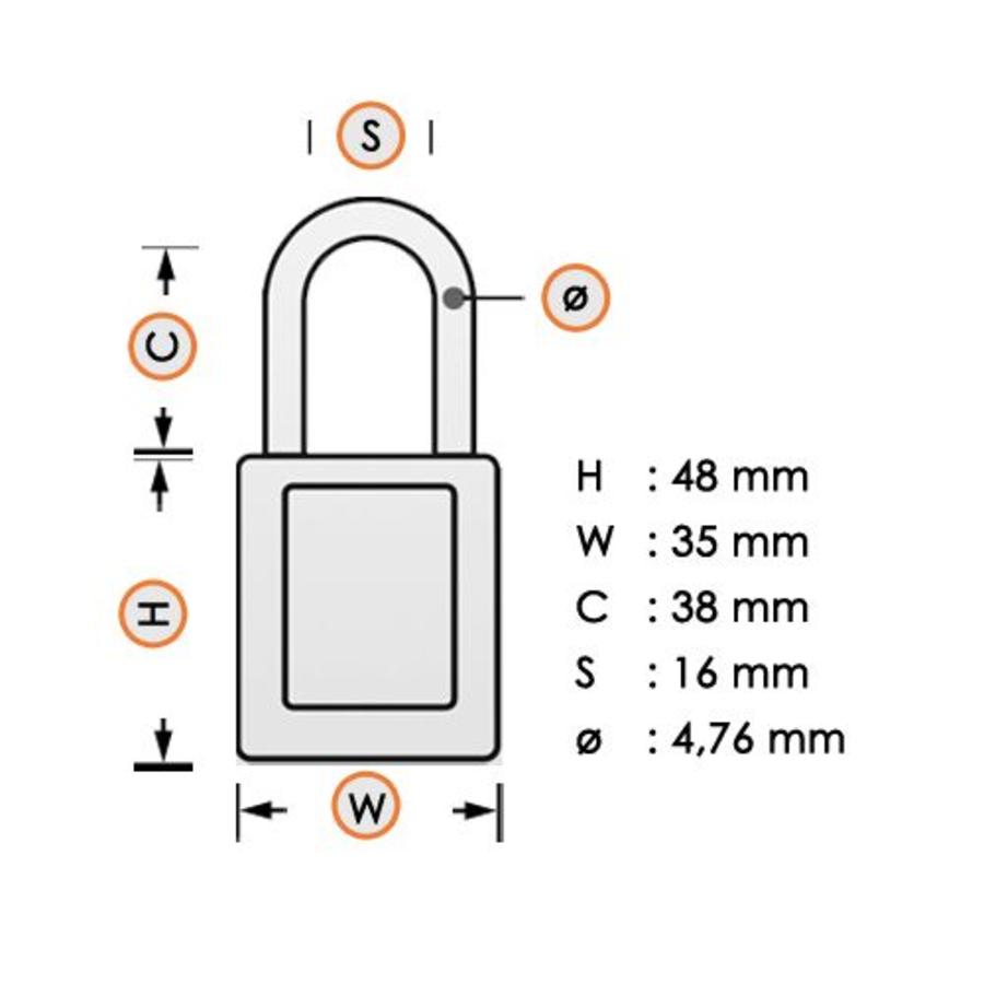 Voldoet aan OSHA-eisen: Ja Aantal geleverde sleutels: 1 (OSHA standaard) Beugeldikte: 4,76 mm Beugel hoogte: 38 mm Beugel materiaal: Nylon Body materiaal: Zenex composietkunststof Lasergravering mogelijk: Ja (optioneel) Sleutelsysteem: Uniek gecodeerd of gelijk gecodeerd Mastersleutel mogelijk: Ja (optioneel) Hangslotlabels: “Danger” en “Property of” in het Frans, Engels en Spaans zijn inbegrepen Sleutelbeheerservice: Ja (optioneel) Sleutelwerking: Niet Vastzittende sleutel Temperatuurbereik: -57 °C tot +177 °C Treksterkteweerstand in gesloten positie: 114 Kg ATEX-certificering: Zone 2 Chemisch bestendig: Ja Corrosiebestendig: Ja Niet-magnetisch hangslot: Ja Siliconenvrij: Ja UV-stabiel: Ja -